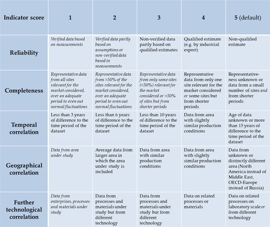 - Weidema, B.P.; Wesnæs, M.S. Data quality management for life cycle inventories—An example of using data quality indicators. J. Clean. Prod. 1996, 4, 167–174. [Google Scholar] [CrossRef]