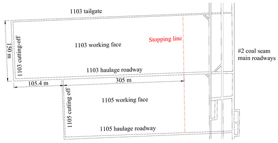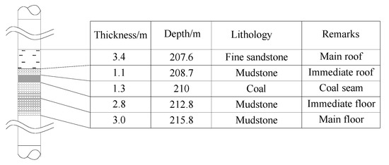 The present analysis was based on the mining conditions of the 1103 working face in the Heilong Coal Mine, located in Linfen City, Shanxi Province of China. The main coal seam mined at the 1103 working face is #2 coal seam dipped 0~20°, of which the average thickness is 1.3 m and the average bury depth is 210 m. Fully-mechanized longwall mining technology is carried out on the 1103 working face. The 1103 working face is adjacent to the 1101 working face (gob), arranged along the coal seam dip. The 1103 working face is a low gassy working face and is 200 m wide (see Figure 2). The immediate roof is mudstone, and the main roof is fine sandstone. Both the immediate floor and the main floor are mudstone. The bore hole columnar section is shown in Figure 3.