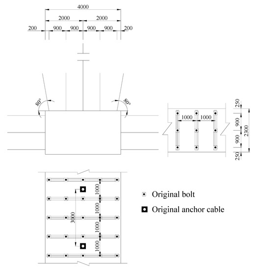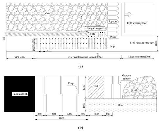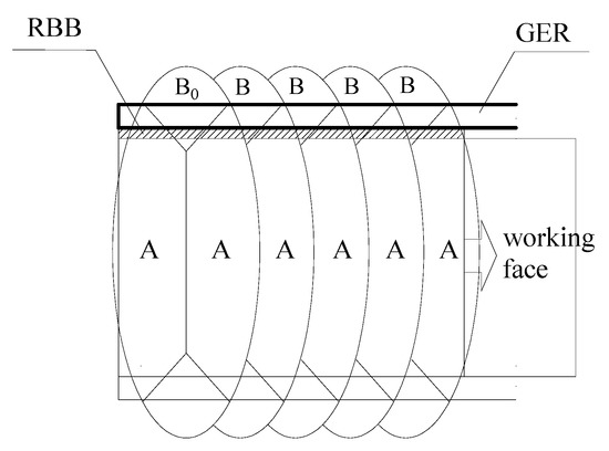 - Anchoring technology for the roof above the RBB. Anchor cables and bolts can be set up before the RBB is constructed. The roof above the RBB would change from unloading state in the vertical direction into triaxial compressive stress state, avoiding strong tensile damage and restraining the further development of joints and cracks in the roof rock mass.