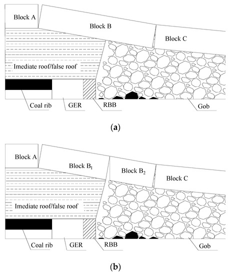 Figure 6. Movement rule and fracture characteristics of Block B during the GER stage. (a) Soft roof fracture state; (b) Hard roof fracture stage. - (2)