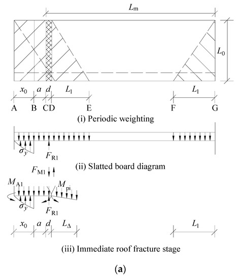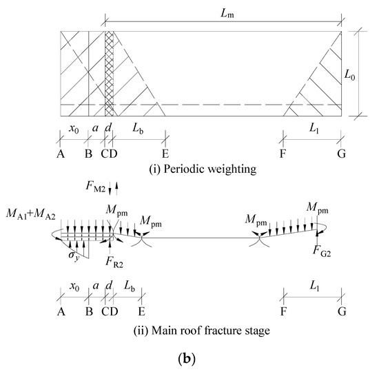 Since the roof plays a key role in surrounding rock control and overlying strata movement, superposition of a continuous layer board mechanical model is established to analyze the relationship between the RBB and the roof for GER with soft roof, floor, and seam in TCMs [41]. According to the action of the solid coal rib and the method of roof load band segmentation, the mechanical model is established, as shown in Figure 7. Therefore, this mechanical model can be divided into two stages: (1) Soft roof (immediate roof) fracture stage; (2) Hard roof (main roof) fracture stage.