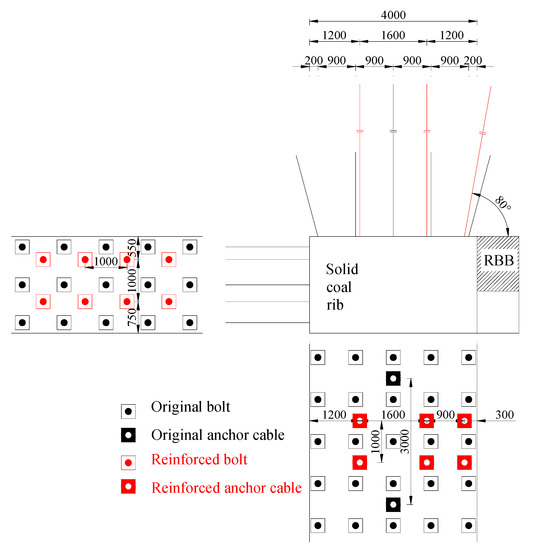 The roof is reinforced by Φ17.8 mm × L6300 mm anchor cables, and three rows are set up with a spacing of 800 mm along the roadway. The anchor cables are arranged by a steel ladder beam welded with round steel, 16 mm in diameter and 2700 mm long. The solid coal rib is reinforced by Φ18 mm × L2000 mm bolts; two rows are set up with a spacing of 1000 mm along the roadway. The bolts are arranged by the steel ladder beam welded with round steel, 14 mm in diameter and 1200 mm long. The detailed reinforcement support parameters are as shown in Figure 8.