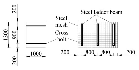 The designed RBB width is 1.0 m, and the water-cement ratio of the high-water quick-setting materials is 1.5:1. Cross bolts (Φ22 mm × L2000 mm) are placed in the RBB to improve the RBB capacity. Two rows of cross bolts are placed with a spacing of 800 mm along the roadway. The cross bolts are made of Φ22 mm rebar. The cross bolts are arranged by the steel ladder beam welded with round steel, 14 mm in diameter and 1200 mm long. The RBB is wrapped by steel mesh made of Φ6.5 mm steel. The detailed RBB construction is shown in Figure 9.