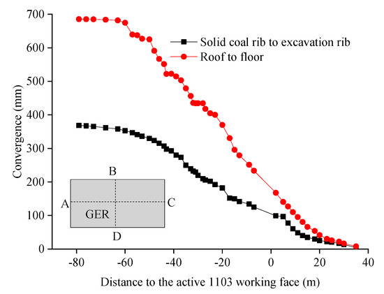 - Surrounding rock characteristics of GER behind the active 1103 working face can be divided into three stages. The first stage is 0 to 10 m behind the active 1103 working face, where the surrounding rock deformation is relatively small. The second stage is 10 to 60 m behind the active 1103 working face, where the surrounding rock deformation is intensively due to the periodic weighting and main roof fracture. The third stage is more than 60 m behind the active 1103 working face, where the surrounding rock deformation is almost stable. The total solid coal rib to excavation rib convergence along the middle of the rib (AC direction) reaches 263.5 mm, while the total floor to roof convergence along the middle of the retained roadway (BD direction) reaches 495.4 mm behind the active 1103 working face.