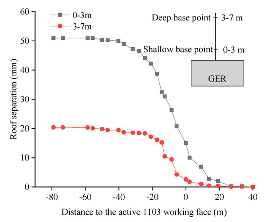 Figure 12 shows the roof separation during the retention of the No. 1103 haulage roadway. It can be seen that no instability separation occurs in the roof anchorage zone. Most of the roof separation occurs between 20 m ahead of the active 1103 working face and 40 m behind the active 1103 working face due to roof movement. Roof separation more than 40 m behind the active 1103 working face keeps stable. Finally, the maximum separation value of the shallow base point is 51 mm, and the maximum separation value of the deep base point is 21 mm. The roof separation value of the roadway is relatively small. It shows that the roof subsidence is effectively controlled by the high-strength bolts, anchor cables, and steel ladder support system, and the roof is safe and stable.