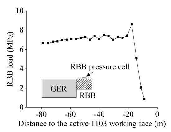 Figure 13 shows the RBB load during the retention of the No. 1103 haulage roadway. It can be seen that the RBB load is less than 2 MPa 0 to 10 m behind the active 1103 working face. The RBB load increases sharply 10 to 30 m behind the active 1103 working face and reaches a maximum of 8.6 MPa with the rotation and subsidence of the main roof. The RBB load remains at 7.1 MPa more than 40 m behind the active 1103 working face. It shows that the RBB with high-water, quick-setting materials has a high resistance, which increases speed, maintains the integrity of the retained roadway roof effectively, adapts the main roof rotation and subsidence, avoids the roof instability separation, and effectively controls the surrounding rock deformation.