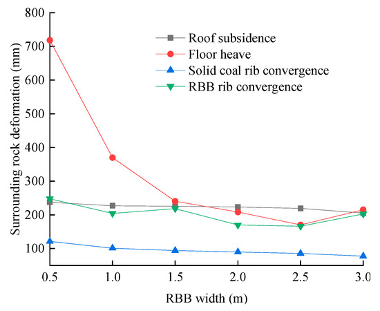 As shown in Figure 15, the influence level from high to low is floor heave, RBB rib convergence, roof subsidence, and solid coal rib convergence. When the RBB width is above 1.0 m, the RBB rib convergence and roof subsidence decrease significantly. With the further increase of RBB width, the RBB rib convergence and roof subsidence still decreases, but to a smaller extent. Therefore, when the RBB width is over 1.0 m, the RBB can maintain the roof and cut off the roof outside of the RBB to promote the surrounding rock stability of GER as soon as possible.