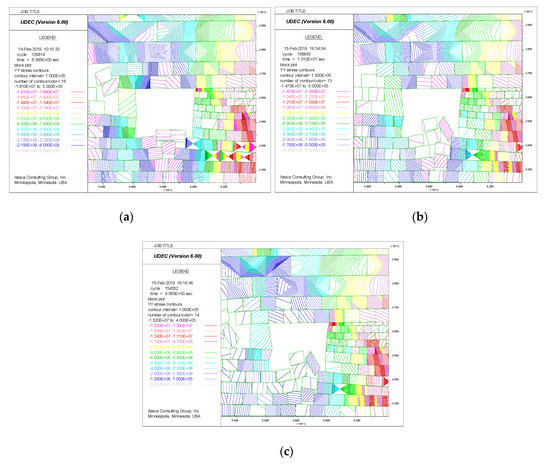 Stress distribution of surrounding rock for GER with respect to water cement ratio. (a) Water cement ratio 1.5:1; (b) Water cement ratio 2.0:1; (c) Water cement ratio 2.5:1.
