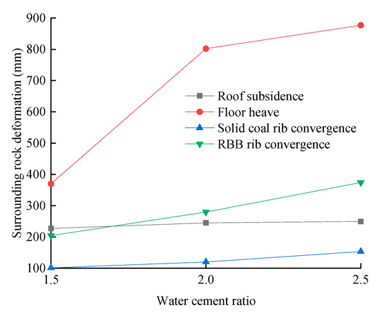 As shown in Figure 17, when the water cement ratio of high-water, quick-setting materials is 1.5:1, the roof subsidence is 227 mm, the floor heave is 369.9 mm, the RBB rib convergence is 204.2 mm, and the solid coal rib convergence is 101.2 mm. When the water cement ratio of high-water, quick-setting materials is 2.0:1, the above deformation amounts are, respectively, 244.9 mm, 802.2 mm, 279.6 mm, and 119.9 mm. When the water cement ratio of high-water, quick-setting materials is 2.5:1, the above deformation amounts are, respectively, 249.5 mm, 876.8 mm, 374 mm, and 153.3 mm. It can be seen that the surrounding rock deformation increases as the water cement ratio increases (RBB strength decreases); in particular, the RBB rib convergence and floor heave increase rapidly under the condition of the same RBB width.