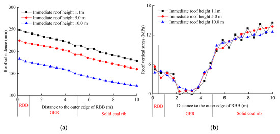 The monitoring line is placed at 0.55 m above the immediate roof, and the roof subsidence and vertical stress above the RBB with the immediate roof height at 1.1 m, 5.0 m, and 10 m are studied by numerical simulation. The results are shown in Figure 18, in which “+” indicates compressive stress and “−” indicates tensile stress (Figure 18b). It can be seen that the roof subsidence above the RBB is larger than that of the retained roadway, and the roof subsidence is linearly negatively related to the distance to the outer edge of the RBB, whatever the immediate roof height is. Moreover, with the increase of the immediate roof height, the roof subsidence decreases. In fact, as the immediate roof height increases, the stiffness of the immediate roof gradually decreases, and the ability of the immediate roof to absorb the deformation energy is gradually enhanced. Therefore, roof vertical stress distribution characteristics with respect to immediate roof height can be summarized as follows, as seen in Figure 18b: