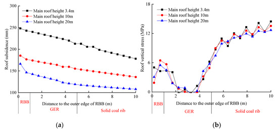 Figure 19 shows the roof subsidence and vertical stress with respect to main roof height (3.4 m, 10 m, 20 m). It can be seen that the roof subsidence above the RBB is larger than that of the retained roadway, and the roof subsidence is linearly negatively related to the distance to the outer edge of the RBB, whatever the main roof height is. Moreover, the roof subsidence decreases as the main roof height increases. In fact, with the increase of the immediate roof height, the ability of the immediate roof to absorb the deformation energy increases. Therefore, roof vertical stress distribution characteristics with respect to main roof height can be summarized as follows, as seen in Figure 19b: