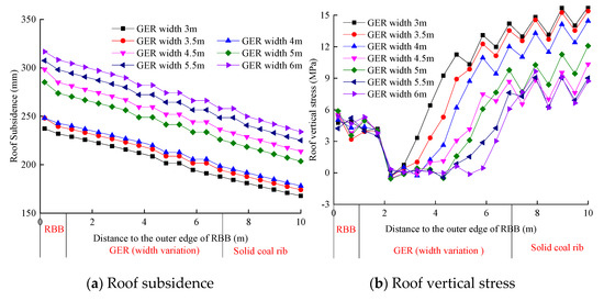 Figure 20 shows the roof subsidence and vertical stress with respect to GER width (3.0 m, 3.5 m, 4.0 m, 4.5 m, 5.0 m, 5.5 m, 6.0 m). It can be seen that the roof subsidence above the RBB is larger than that of the retained roadway. As the distance to the outer edge of the RBB increases, the roof subsidence close to the gob decreases more quickly than that close to the retained roadway. Moreover, the roof subsidence increases as the GER width increases, especially when the GER width is more than 4.0 m. Therefore, roof vertical stress distribution characteristics with respect to GER width can be summarized as follows, as seen in Figure 20b: