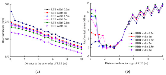 Roof subsidence and vertical stress with respect to RBB width. (a) Roof subsidence; (b) Roof vertical stress.