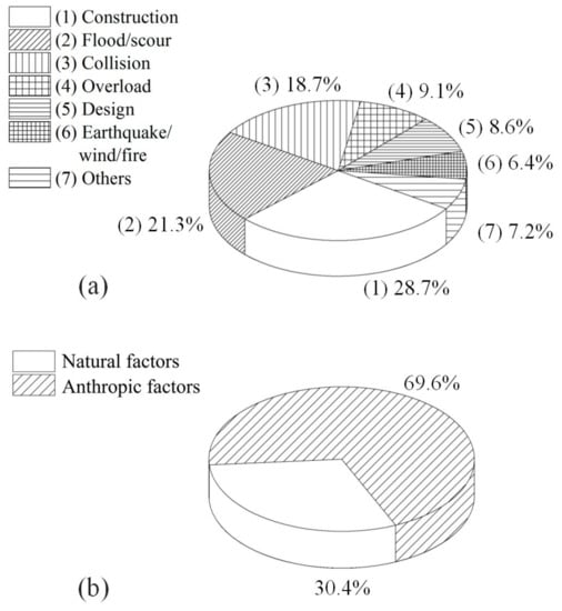 - The statistical analysis on the bridge failures from 2009 to 2019 showed that about 70% of bridge failures were due to anthropic factors, which is a much larger proportion than those caused by natural factors (30%). These safety accidents cause great losses of life and property, which expose the problems in bridge construction management hindering the sustainable development of society.