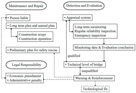 - Dong, Y.H. Research on bridge maintenance management system. Master’s Thesis, Chang’an University, Xi’an, China, 2014. (In Chinese). [Google Scholar]
