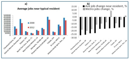 The U.S. metro areas with the greatest increases and decreases in job proximity, 2000–2012: (a) Average jobs near a typical resident; (b) Average percent job change near residents and an overall metropolitan job change. Source: [].