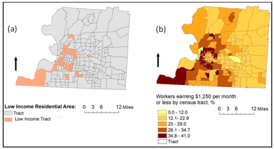 (a) Low-income residential areas (42 tracts used in the study); (b) distribution of workers earning $1250 per month or less by census tract in Shelby County, TN, 2016.