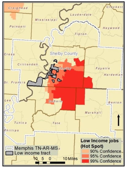 We also matched workplace locations for commuters from low-income residential tracts in Shelby County. The study used an approach similar to that used by Morton et al. [], who simulated likely place of work for worker categories whose residential locations and workplace industries were known. By using the reported journey to work tract-to-tract mean travel flows by industry, the number of employees working for each business in every industry in each block group has been inferred by summing them up and calculating the probability that a randomly selected resident living in a certain home tract and working in a certain industry works in a block group. Given that commute distribution is known (from the 2012–2016 CTPP tract-to-tract flow data), we also need to know how many jobs a certain population segment could reach that match their skill set within a given commute shed. In order to match workplace locations, we used the following approach. We combined the Census Transportation Planning Products (CTPP) journey-to-work tract-to-tract mean travel flows (CTPP 2012–2016) with employment data provided by the LED. More specifically, we first identified locations of low-paying jobs across the states of Tennessee, Arkansas, and Mississippi using the LED-based job data by worker earnings on the work end (that is, only the low-paying job market segment, or employment paying $1250 per month or less was used) and exported these obtained shapefiles of work areas to the GIS aggregating low-paying jobs at the tract level. This was done by using each business point’s earning level data, and then summing over the number of employees working for each business in every census tract within a particular earning category (here, with wages of $1250 or less per month). Second, to quantify observed patterns, we used a spatial pattern analysis, specifically, a statistical method of Hot Spot Analysis (Getis-Ord Gi*) with 90, 95, and 99 percent confidence levels. The Hot Spot Analysis evaluates the spatial arrangement of features and uses a statistical measure (that is, the Getis-Ord Gi* statistic with Z-scores, or standard deviations, and p-values, or statistical probabilities) to find areas with statistically significant concentrations of a phenomenon of interest, here low-wage employment. Generally, hot spots represent areas where observed spatial patterns are not due to random processes, but they are rather locations where underlying spatial processes are at work []. Thus, we identified concentrations of low-paying jobs across all tracts in the study area. The hot spots (shown in red color for the Memphis metropolitan area) in Figure 4 denote low-wage hot spots found in 854 tracts out of 2847 total tracts in the study area (not shown in the map), as well as the location of low-income residential tracts in Shelby County. The identified low-wage clusters contained 535,038 low-income jobs in total, capturing 41.7% of a total 1,283,634 low-paying jobs in the 3-state area of Tennessee, Arkansas, and Mississippi (out of 2,211,546 paying jobs in these 854 tracts in total).