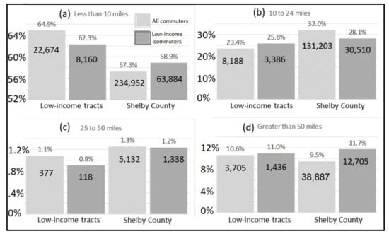 The 2012–2016 CTPP data require matching to appropriate employment to realistically understand commuting distance for a particular labor market segment, such as low-income commuters. However, the LED jobs by distance data can be extracted for a desired group of commuters, thus, requiring no matching, providing absolute and relative job counts broken out by four commute distance categories (less than 10 miles, 10 to 24 miles, 25 to 50 miles, and greater than 50 miles). It can answer a question of what distances do local workers commute? The analysis outputs data of the distance totals between residence and employment locations for workers living in the study area and employed elsewhere. The data are useful to examine the movement of workers from their homeplaces to their workplaces. Figure 5 presents job count data by commuting distance from home areas both in low-income tracts and in the entire Shelby County to work tracts by labor market segment (that is, separately for all commuters and low-income commuters, i.e., workers earning $1250 per month or less) using the LED jobs by distance data, 2016, providing both relative (above the bars on the chart) and absolute (inside the bars) values. It can be seen that consistently many more low-income workers travel long distances (greater than 50 miles) compared with an average commuter (11.7% vs. 9.5%).