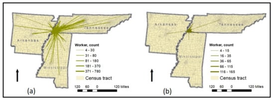 Commuting flows by commuters from (a) all residential tracts and (b) low-income tracts in Shelby County, 2016, to all tracts in TN, MS, AR. Source: Census Transportation Planning Products (CTPP) 2012–2016.