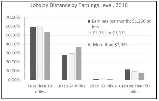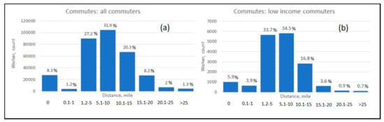 Figure 7 uses the CTPP 2012–2016 data and shows proportion of jobs located within specified distance bands for the typical worker and workers residing in low-income neighborhoods. For example, less than 6% of workers from low-income areas commuted within the same residential areas compared to the typical worker (over 8%). Within the average commuting distance of 7.8 miles, about three quarters of jobs are available for workers residing in low-income neighborhoods within the average commuting distance of 7.8 miles. The average traveler has access to 68% of jobs within the average commuting distance of 10 miles. The LED data allows a researcher to conduct a distance analysis for a desired labor market segment without having to match it to workplace locations and directly extract data from home areas under investigation. This option outputs data as a categorical variable in four ranges (e.g., jobs within less than 10 miles, 10–24 miles, 25–50 miles, greater than 50 miles). Gabe et al. [] used midpoints of the ranges when a variable under consideration was categorical. Similarly, for the purposes of estimating the number of miles travelled during the commute, we used midpoints of the ranges for the number of miles travelled. Table 6 reports the distribution and the average commuting distance for low-income residents to low-wage jobs compared to the other two income/wage categories.
