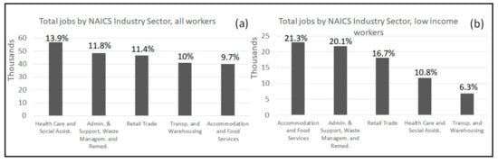 Distribution of jobs by NAICS Industry Sector in Shelby County, TN, 2016: (a) total jobs of all workers; and (b) total jobs of low-income workers.