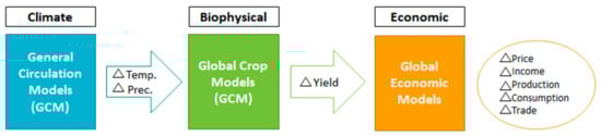 The potential impact of weather conditions on crop production through biophysical models can be used as input in different partial and general equilibrium economic models to analyze the economic response of climate change by different socio-economic agents of society (