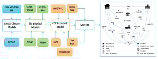 The economic analysis of the impact of climate change on agricultural production of Pakistan begins by introducing a common set of climate change scenarios and crop yield inputs to be used as shocks in the global economic model. This integrated economic modelling framework of climate change links global climate models to an economic model through biophysical models. This research considers GCM MPI-ESM-MR global climate model of the latest Coupled Model Inter-comparison Project (CMIP5) family that combines a representative concentration pathway 8.5 (RCP 8.5), i.e., the most extreme emissions scenario. Moreover, the model considers socio-economic pathways (SSP2) in order to describe the future economic and population growth of the world. The climatic projections of the mid-21st century from the climate model are used [