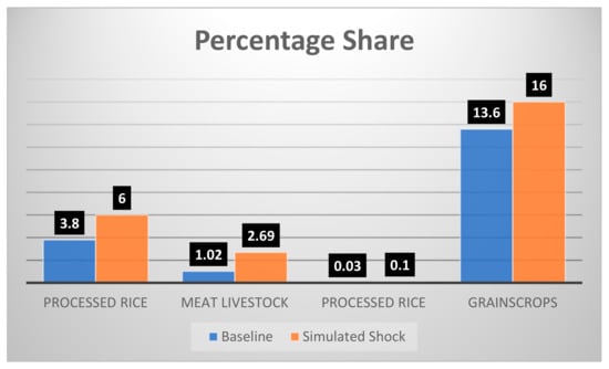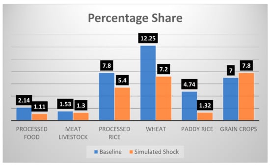 43]. A comparison between baseline, i.e., without climate change, and the counter-experiment with climate change effects describe the economic impact of climate change-induced decline in wheat and rice production in Pakistan by 2050.