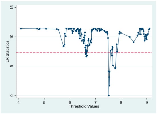 To check the robustness, we further investigate the panel threshold regression to trace the exact point at which institutional quality changes to nonlinearity. Although traditional approaches that use a quadratic term of an explanatory variable to find nonlinearities are successful, these fail to identify potential structural breaks [56], the exact point at which the relationship turns in the opposite direction and how it does so. In such a case the panel threshold model proposed by [57,58] is an appropriate solution that can trace the turning points. Therefore, the panel threshold regression with a single threshold value is established as follows: