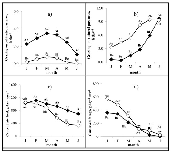 Interaction means for (a) cultivated pasture grazing, (b) natural pasture grazing, (c) the use of concentrate feed, and (d) conserved forage for management systems and sampling months. Semi-intensive management is represented by (♦) and extensive management by (◊). J: January, F: February, M: March, A: April, M: May, J: June. Values with different capitilized letters represent statistically significant differences between management systems, and those with different lowercase letters represent statistically significant differences between months within the same system (p-value < 0.05).