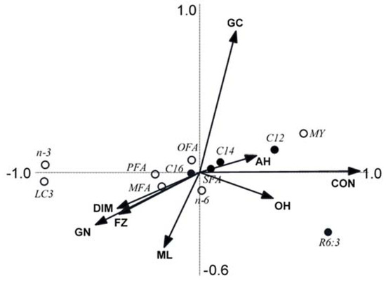 Biplot derived from redundancy analyses showing the relationship between milk yield (MY), the content of fatty acid groups (SFA: saturated fatty acids; MFA: monounsaturated fatty acids; PFA: polyunsaturated fatty acids; OFA: odd-chain fatty acids; n-3s: omega-3 fatty acids; n-6: omega-6 fatty acids; LC3: very long omega-3 fatty acids), R6:3: the omega-6 to omega-3 ratio, the content of major fatty acids in milk fat (C12: lauric; C14: myristic acid; C16: palmitic acid), nutritional variables (GC: grazing time on cultivated pastures; GN: grazing time on natural pastures; FZ: floristic zone; CON: total supplementary concentrate; OH: oat hay; AH: alfalfa hay), the days in milk (DIMs), and the milking system (ML).