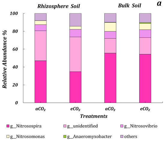 As shown in Figure 5b, the dominant genera of microbes which possess nirK gene in the studied soil were Rhodopseudomonas (13.5%–21.1% in proportion), Bradyrhizobium (11.9%–18.4% in proportion), Rhizobium (11.2%–19.4% in proportion), Sinorhizobium (9.0%–12.2% in proportion) and Mesorhizobium (8.0%–14.9% in proportion) etc. Some genera were higher in proportion in the rhizospheric soil than in the bulk soil, which included Rhodopseudomonas (18.4%–21.1% vs. 13.5%–15.2%) and Bradyrhizobium (18.1%–18.4% vs. 11.9–14.4%); while, genera lower in proportion in the rhizospheric soil than in the bulk soil included Rhizobium (11.2%–14.3% vs. 14.3%–19.4%), Mesorhizobium (8.0%–11.8% vs. 14.5%–14.9%) and Sinorhizobium (9.0%–10.4% vs. 10.9%–12.2%). Under the eCO2 condition, Mesorhizobium exhibited to be higher in the proportion in the rhizospheric soil than under the aCO2 condition (11.8% vs. 8.0%). However, there was no significant difference in the proportion for Mesorhizobium in the bulk soil between eCO2 and aCO2 conditions. The Bradyrhizobium showed to be higher in proportion in the bulk soil under the eCO2 condition than under the aCO2 condition (14.4% vs. 11.9%).