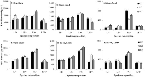 For both soil types, root biomass decreased for consecutive soil layers for all species compositions (Figure 1). The root biomass of the 0–60 cm layer of LP− was, on average, 1500 kg ha−1 higher on the sandy soil than on the loamy soil. For FA+, the root biomass was 1800 kg ha−1 higher on the loamy soil than on the sandy soil. In the 0–10 cm soil layer, the effect of species composition was significant for both soil types, with the highest root biomass values for FA+, followed by LP+ (see Table 4 and supplementary materials, Table S5). Root biomass of the mixture with tall fescue (LFT+) was similar to unfertilized perennial ryegrass plots.