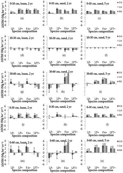 Average rates of change of soil organic matter (ΔSOM) in Mg ha−1 yr−1 per soil layer per treatment for the period September 2011 to January 2014 (sand and loam, 2 years) and the period September 2011 to May 2016 (sand, 5 years). LP− = unfertilized perennial ryegrass. LP+ = fertilized perennial ryegrass. FA+ = fertilized tall fescue. LFT+ = fertilized perennial ryegrass, tall fescue, and white clover. Simulated grazing systems: CG = continuous grazing, LG = lenient strip grazing, and RG = rotational grazing. All results of the analysis of variances on SOM dynamics underlying the results of Figure 2 are given in the supplementary materials, Table S7. Standard errors of means are provided in the first treatment and apply to all grazing–species combinations.