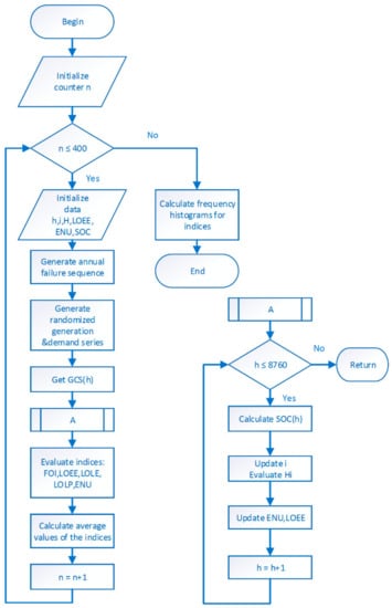 - Initialize counters: h = 1 (number of simulated hours of the year); i = 0 (counter of interruptions); H = 0 (hours of interruption); LOEE = 0; ENU = 0, SOC = 80% (battery state of charge).