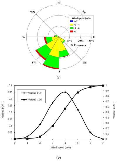 Figure 4 shows the wind characteristics of Deokjeok Island prepared using wind data (2005–2015) measured at 10 m height as measured by Korean Metrological Administration (KMA) [24] and analyzed by the authors [22]. The most frequent wind speed is 4 m/s as shown in Figure 4b.
