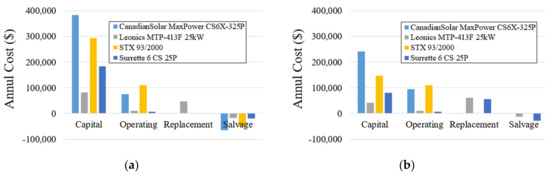Figure 7 and Figure 8 show the NPC and annualized costs of all the equipment of both system solutions, respectively. Both the figures indicate that solar panels are the most expensive equipment and also, their annual maintenance cost is the highest as well for both systems. Capital cost includes different type of costs occurred at the start of the project such as equipment cost, installation cost, labor cost and transportation costs. As it is clear from Figure 7 and Figure 8 that capital cost is almost 70% of the total NPC and annual cost. The second type of cost is annually occurring operating and maintenance cost which includes workers’ salaries, annual cleanliness cost, fuel cost and electricity cost to run the auxiliary equipment at the power plant. Replacement cost is used to buy new equipment during the project running time, once the lifetime of any equipment has finished, as shown in Table 1. Salvage are those benefits which are obtained by selling all the project equipment and other items after the project lifetime of 20 years. In Figure 7 and Figure 8, positive cash flow represents costs and negative cash flow (salvage) are benefits.