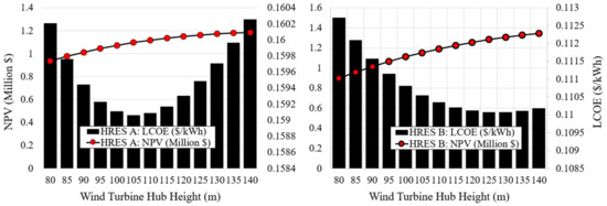 Figure 9 shows the impact of wind turbine hub height on the economics of both systems i.e., HRES A and HRES B (NPV is the net present value which is the difference between present values of benefits and costs, NPV > 0 is must [27]). It is important to estimate the appropriate hub height as it has a direct effect on the electricity generated by wind turbine, which subsequently changes the values of NPV and LCOE. As the hub height increases, wind turbine rotor interacts with relatively higher wind speeds as compared to lower heights, which generates more electricity but, at the same time cost of tower increases and VICE VERSA for lower hub heights. So, it is a trade-off between more electricity and the cost of the tower. Figure 9 determines the optimal hub-height for each case.