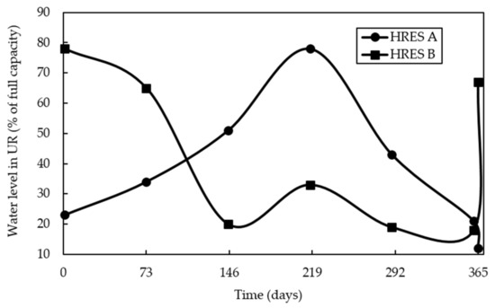 Figure 10 shows the amount of water in UR throughout the year for both systems A and B. During the summer season UR is almost fully filled with water for system A whereas it is winter season for system B. On average basis, water level in UR is less than 50% for 252 days in case of system A and it is 298 days for system B. Minimum levels of water in UR for both systems have already been mentioned in Table 7. One of the reasons for very low water level during winter and summer seasons (in case of HRES A and HRES B respectively) is due to the high consumption of electricity during these days. In South Korea, during the winter season, the minimum temperature passes below -15 °C which requires relatively more electrical energy for heating the indoors of buildings, resulting in high-demand of electricity. Similar conditions can be associated with the summer season in terms of cooling the indoors of buildings. Although Figure 10 just shows the water level in UR at any time of the year, this behavior can be associated with the demand for electricity during the year. The trends are different in both cases mainly due to the different architecture of both systems as shown in Table 4.