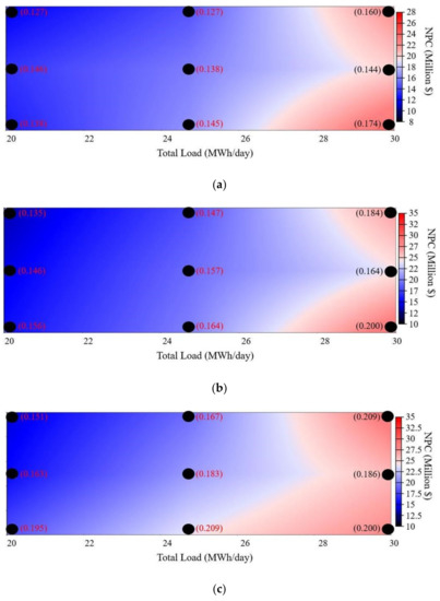 Feasible HRES solutions with NPC superimposed over levelized cost of energy (LCOE) (a) Interest rate: 4%; HRES Life: 15 years (b) Interest rate: 6%; HRES Life: 20 years (c) Interest rate: 8%; HRES Life: 25 years.