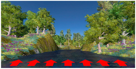 The Unity 3D terrain editor, used in the virtual tool, ensures that the stability conditions of the banks and the uniformity of the whole cross-sectional profile are observed (Figure 1), while the Unity 3D asset called AQUAS, modifying the flow velocity value and direction, allows the water movement to be orthogonal to the cross-section and the velocity distribution to be regular (Figure 2). Moreover, managing the water color, bank fade, and bank and depth transparency, AQUAS controls the depth for the immersion of the instruments. The Unity 3D asset named Vegetation Studio, instead, creating vegetation along the banks and within the river, shows when the conditions of the cross-section are ideal to measure the water discharge, that is unobstructed by trees and aquatic growth (Figure 2).