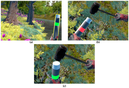 The demarcation of the site is simulated through the installation of posts on the two banks, used as clearly visible and readily identifiable markers. In this scenario, the user/operator learns to grab a post with one hand and the hammer with the other, hitting its top and so simulating hammering in the post. Such part of the post is represented by a white/grey cylinder which, as all the other tools, is colored in yellow when touched by the user (Figure 3a). When the hammer collides with the top of the post, a trigger is activated, turning the post red if it is misplaced (Figure 3b) and green when it is positioned correctly (Figure 3c).