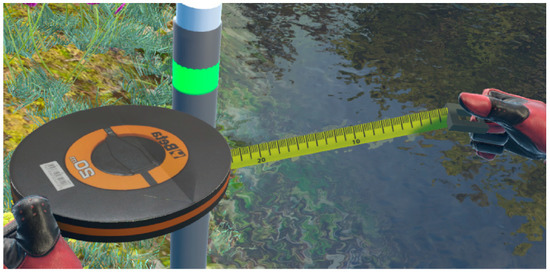 The measurement of the width is simulated by the user who divides the section areas into several verticals and acquires, through a graduated tape, their horizontal distance from or to the reference post on one bank of the channel (Figure 4). The choice of intervals between the segments is suggested during this step: the accuracy of the water discharge measurement is increased by narrowing the space between verticals. The tape was implemented through the ‘simple cable’ Unity 3D asset, which allowed reading the centimeters and meters clearly in real-world scale. A dynamic texture mapping is used in order to visualize the unit of measurement displayed on the tape as the cable extends.