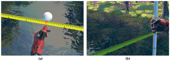 The virtual reality system allows the user to mark the verticals with white spheres, placed along the cross-section following the metric rope and pressing the button of the Oculus Touch controller. On the same verticals, the user detects the depth through a graduated rod in order to obtain the cross-sectional area (Figure 5a,b).