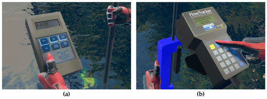 In the last step, the user simulates the acquisition of the point velocities through two different sensors: the classical current meter and the sophisticated acoustic velocimeter (Figure 6a,b). The two instruments allow workforces to measure in field using both the traditional and the more advanced surveying technology. They were chosen because they are the most largely used for the evaluation of the water discharge in open-channel cross-sections. In particular, the current meter, besides being the easiest-to-use instrument, is also the most reliable as it has been tested on a significant amount of rivers so far. On the other hand, the Acoustic Doppler Velocimeter (ADV) provides highly accurate data in short time and gives the water discharge values directly, without the need of calibration and/or conversion formulas. The use of only two sensors avoided distracting the technicians from the main aim of the virtual tool, which was learning the water discharge measurement technique and methodology. The current meter is composed of two wading-rods, one of which slides inside the other. At the end of the adjustable rod there is a propeller, which begins to rotate as soon as it touches the water. Once the propeller is placed at the desired position, the user sets a timer and presses the start button on the handheld keypad. When the measurement is finished, the keypad produces a beep, as it happens in a real case. The Acoustic Doppler Velocimeter is the SonTek one, named Flow Tracker, which has a sensor and two rods, one of which is extendable. The sensor is attached to the extendable rod in order to allow the user to change its position along the vertical from the channel bed to the free surface. Once the sensor is placed at the selected point on the vertical, the user presses the different commands on the handheld keypad to carry out the measurement.