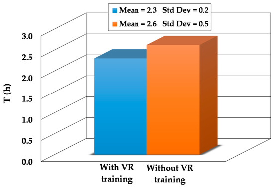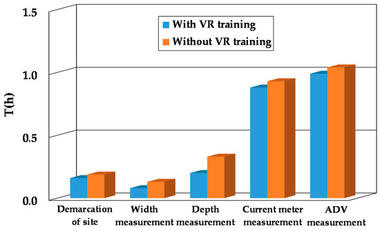 The comparison between the times employed for the completion of the whole measurement procedure obtained from both groups is reported graphically in Figure 8. It is interesting to note how for the first group the mean value is only 12% lower than the one detected for the group without the virtual training, while the standard deviation shows a higher reduction of about 60%. This underlines how the total time employed is not significantly decreased on average but most fieldworkers complete the procedure faster, thanks to the use of the VRLab. In order to know the step that slowed down the field activity, completion times for (a) the demarcation of the cross-section, (b) the measurement of the width with the metric rope, (c) the measurement of the depth with the graduated rod, and (d) the measurement of the velocity through both the current meter and the Acoustic Doppler Velocimeter were evaluated. As observed in Figure 9 and Table 5, the use of the velocity sensors took more time in comparison with the other phases and the training with VR does not seem to have increased the quality of the action implementation that much. On the contrary, the cross-section width and flow depth measurements recorded higher differences between the mean values of two groups. This shows a clear improvement of the workforces’ technical skills after the virtual training, especially for the easiest operations.