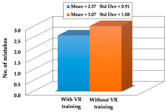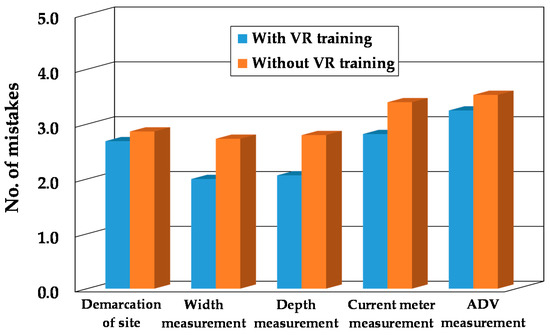 The number of mistakes on the whole procedure has a higher mean value and dispersion without VR training (Figure 10). This is due to a greater number of teacher’s interventions for the second group. Looking closely at the mistakes in each step, the ones with a higher mean value are the tasks perceived as more difficult (Figure 11 and Table 6). In particular, for the installation of the posts on two banks, the mean value and the level of dispersion are nearly 6% lower than the ones without virtual training, due to the type of ground not always easily penetrable. Even the use of ADV has a small difference between the mean values and standard deviations (about 8% and 5%, respectively), because of the difficulty in memorizing the functions of the different buttons on the handheld keypad.