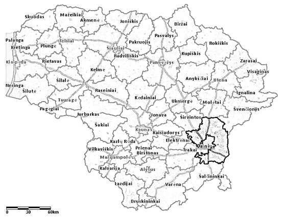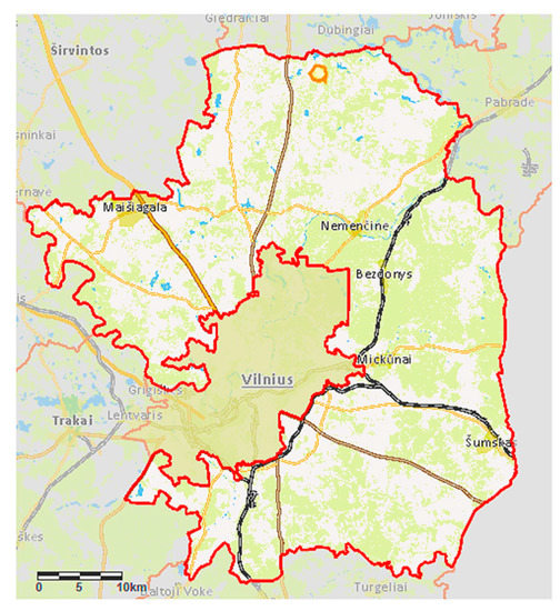 The selected research case study was Vilnius District Municipality, near Dirmeitai village (Figure 1 and Figure 2), as the majority of abandoned agricultural land, evaluating the total area of each municipality, was situated in Vilnius District Municipality [14].