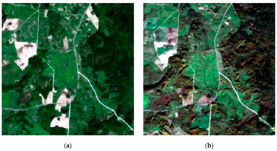 Data of the study area: (a) Sentinel-2 RGB images (10 m spatial resolution) 10 May 2018; (b) Sentinel-2 RGB images (10 m spatial resolution) 18 October 2018.